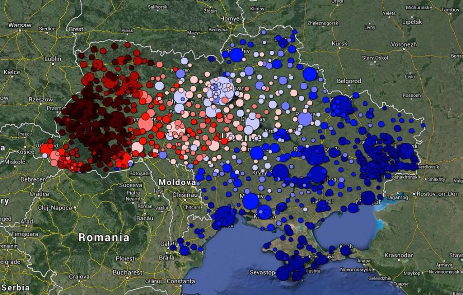 Визуализация языковых данных социальной сети «ВКонтакте». Русский — синий. Украинский — красный