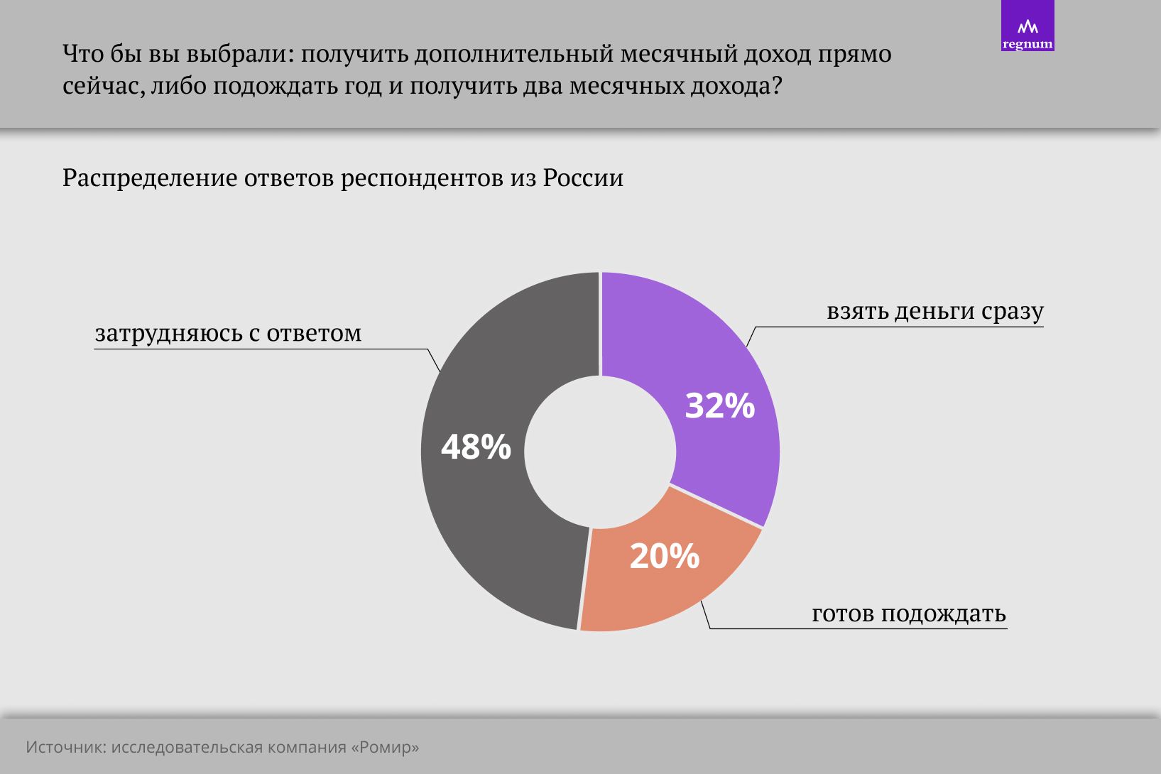 Россияне ответили так: примерно треть (32%) выбирают взять деньги сразу, пятая часть (20%) готовы подождать, чтобы удвоить сумму. А больше всего людей — почти половина респондентов (48%) — затруднились с ответом.
