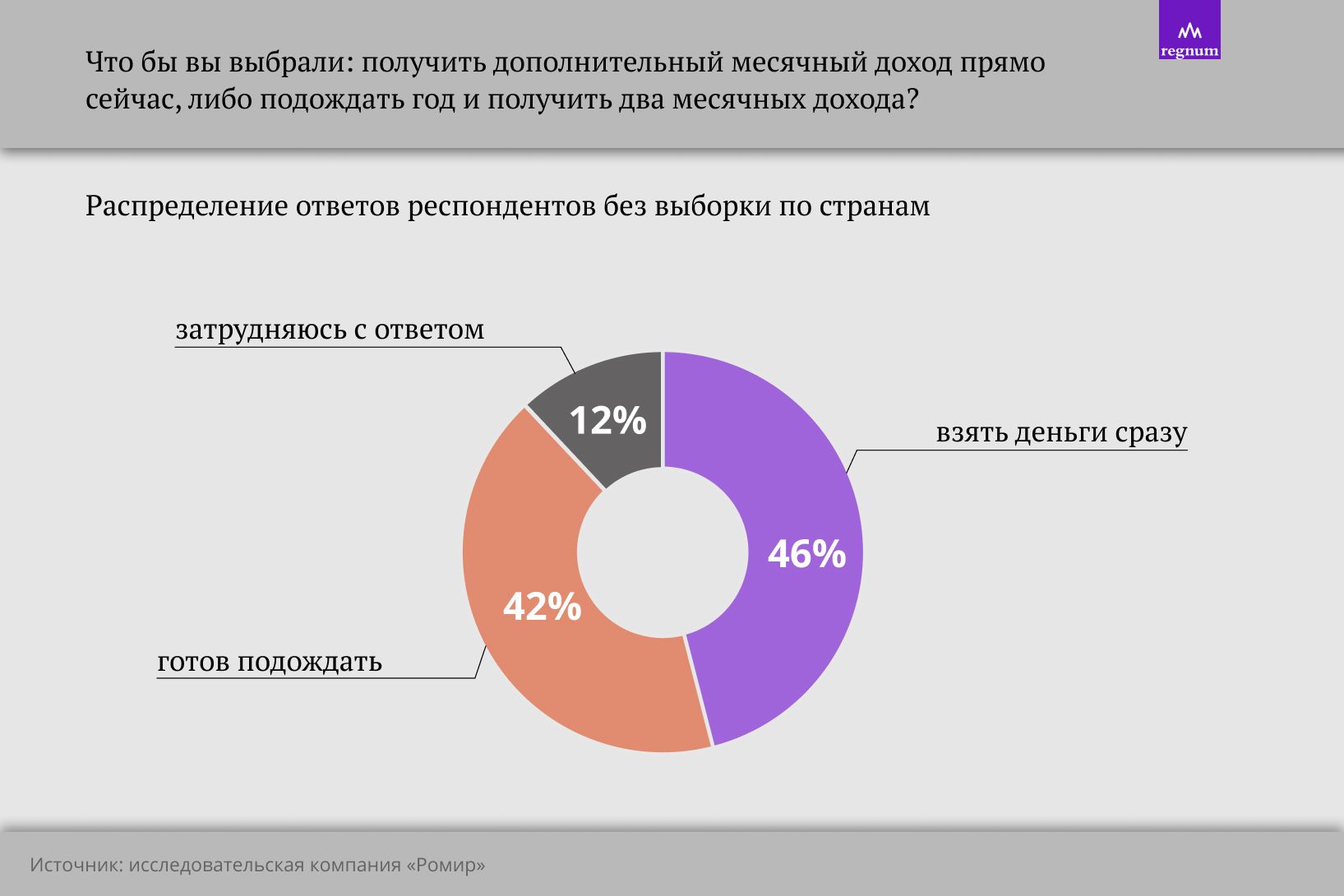 Результаты одного из самых интересных опросов последнего времени опубликовала исследовательская компания «Ромир». Россиян спросили, что они выбрали бы: получить дополнительный месячный доход прямо сейчас, либо подождать год и получить два месячных дохода?